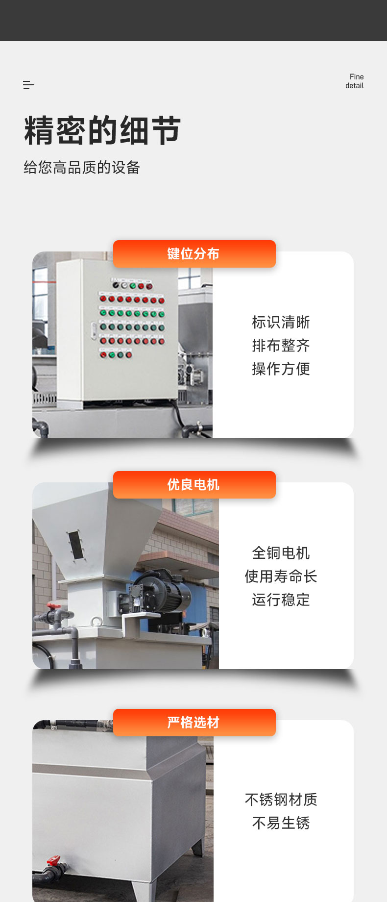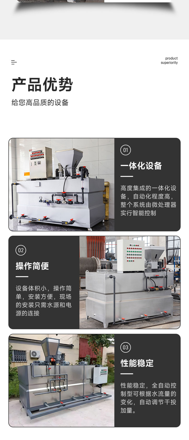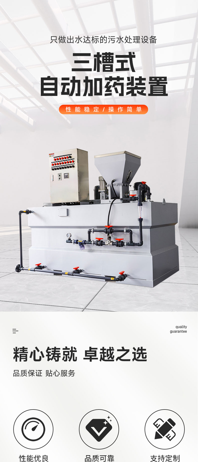 - 一、三槽式自動(dòng)溶藥裝置的簡(jiǎn)介三槽式自動(dòng)溶藥裝置連續(xù)調(diào)配聚合物溶液的自動(dòng)化設(shè)備機(jī)器。主要由三腔藥箱、自動(dòng)吸料機(jī)、自動(dòng)溶粉機(jī)、自動(dòng)配水系統(tǒng)、出藥系統(tǒng)、就地電氣控制系統(tǒng)等組成。加藥螺旋采用變頻調(diào)速可滿足固體和液體絮凝劑的自動(dòng)制備。中泰-三槽式自動(dòng)溶藥裝置圖片二、三槽式自動(dòng)溶藥裝置的工